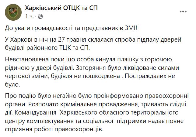В других регионах Украины военкомам живётся не легче. Так, украинец рассказал, что в Черновицкой области 7 сотрудников ТЦК вместе с полицейскими остановили 3-х мужчин, которые оказались спортсменами. Они побили силовиков и отобрали табельное оружие. Месяц назад в тех же Черновцах трое местных жителей напали на военкома, который открыл стрельбу по местным жителям. В Харькове даже стали сжигать военкоматы. Об произошедшем накануне поджоге со ссылкой на местную власть пишет военный паблик «Направленец по Украине».