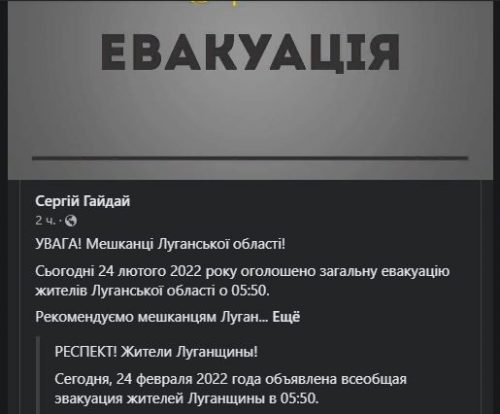 «Сегодня 24 февраля 2022 года объявлена общая эвакуация жителей Луганской области в 05:50», - написал он на своей странице в Facebook.