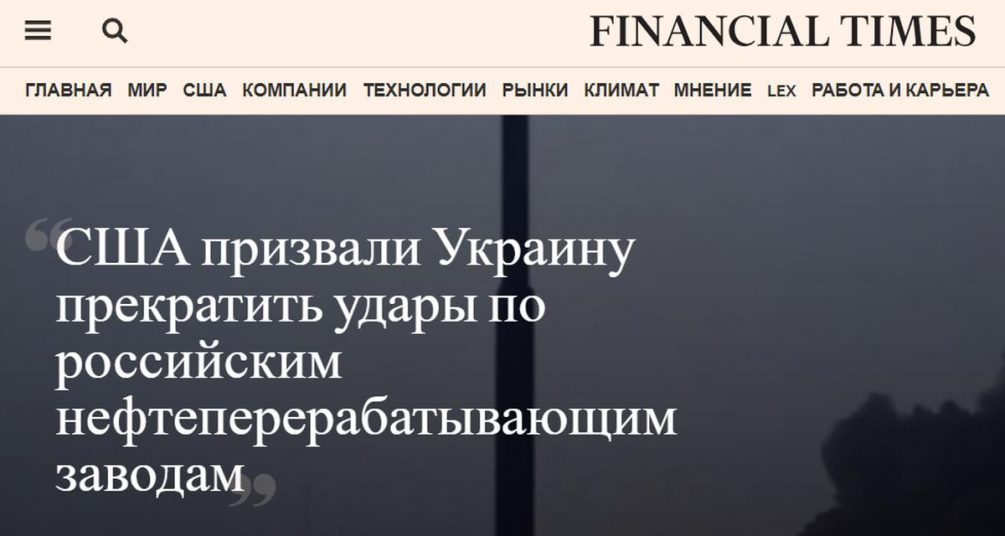 Западная пресса тоже писала на эту тему. Газета Financial Times сообщала, что Вашингтон призывал Украину остановить удары по российским нефтеперерабатывающим заводам, так как это вызовет сбои в поставках и повлияет на мировые цены. Кроме того, американские чиновники были обеспокоены тем, что атаки Украины затронут поставки, на которые опирается Запад — то есть поставки по КТК.