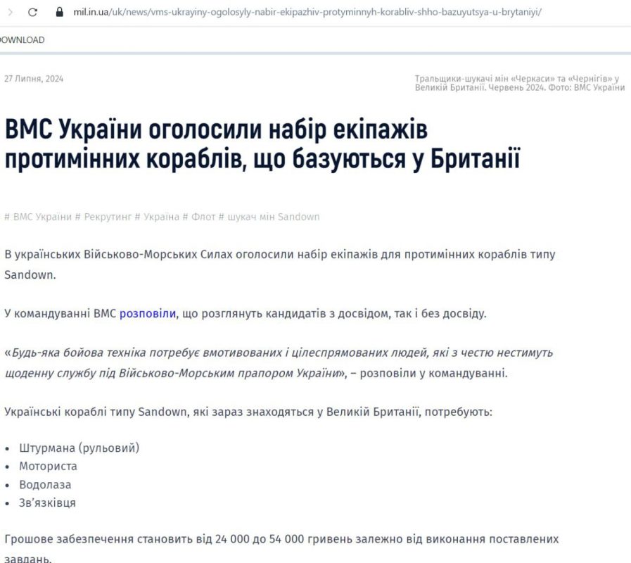 В объявлении, размещенном на сайте ведомства, сказано, что на минные тральщики требуются штурманы, мотористы и другие члены экипажа. ВМС даже готовы брать кандидатов без опыта. Это должно привлечь тех, на кого охотится ТЦК на улицах украинских городов.