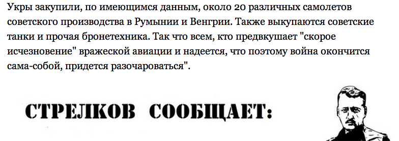 Такую информацию опубликовал министр обороны Донецкой народной республики (ДНР) Игорь Стрелков в сети интернет. По его словам, для участия в карательной операции на Юго-Востоке украинская сторона купила около двадцати самолетов. Все они еще советского производства. Продавцы – бывшие участники Варшавского договора, куда СССР поставляла свою военную технику – Румыния и Венгрия. Какие именно самолеты Украина закупила за рубежом - не уточняется. В этих же странах, по данным Стрелкова, Украина закупает и другой «металлолом» - советские танки и прочую бронетехнику. Таким образом, резюмирует Стрелков, на «скорое исчезновение» вражеской авиации надеяться не приходится. Тем, кто надеется, что война «окончится сама собой, придется разочароваться».
