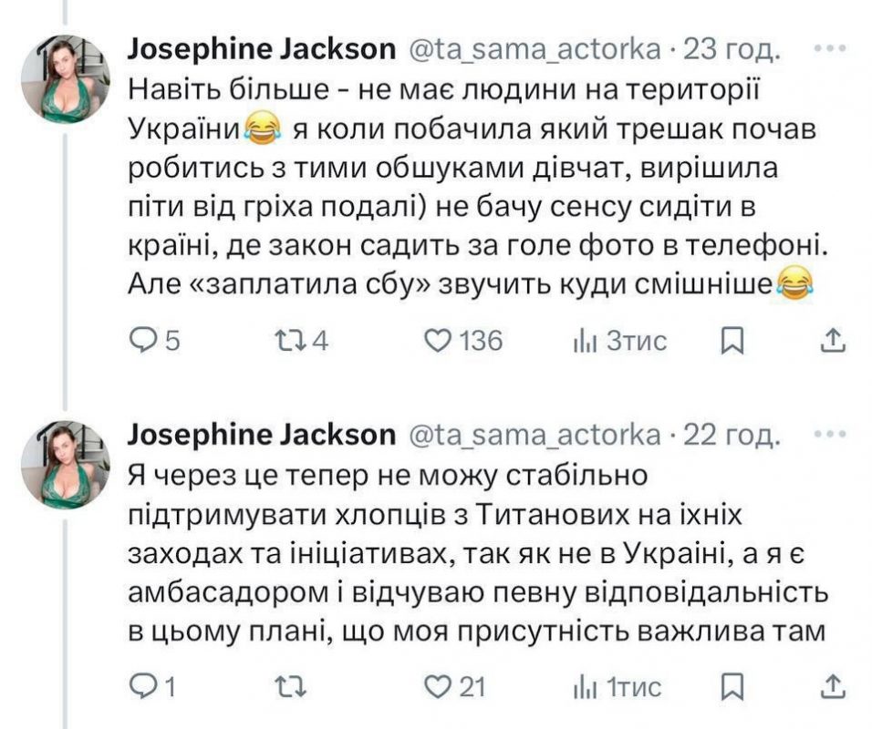Актриса сообщила на своих страницах в социальных сетях: все, Украина ее допекла и она покидает родные края насовсем, а не просто уезжает в командировку на новые съемки. По ее словам, «треш» с обысками других подобных «девочек», а также возможность попасть на зону «просто за голое фото в телефоне», вынуждают ее сказать Украине последнее «прощай».