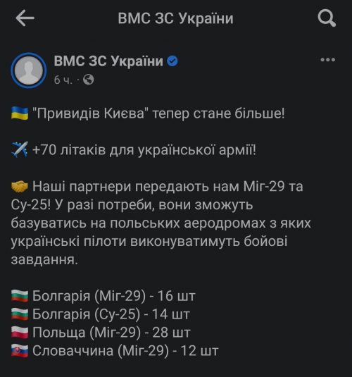 Пресс-служба украинских ВМС на своей странице Facebook сообщила, что Болгария, Польша и Словакия поставят Украине 70 боевых самолетов. По данным ведомства, Болгария передаст 16 истребителей МиГ-29 и 14 штурмовиков Су-25, Польша выделит 28 МиГов, а Словакия — 12.
