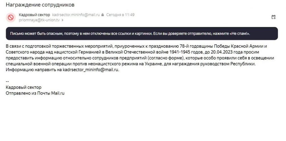 В письмах предлагается предоставить информацию служебного характера о сотрудниках. Рассылка производится с электронного ящика, адрес которого напоминает официальный ресурс. Однако сам бланк письма, реквизиты, его содержание и электронный ресурс - поддельные.