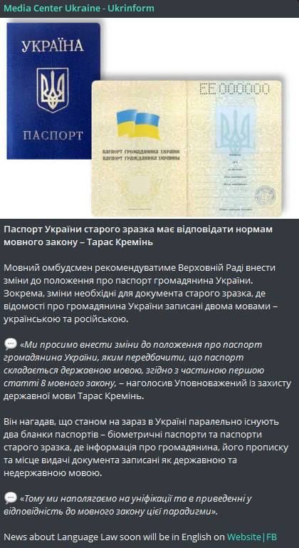 «Мы просим внести изменения в положение о паспорте гражданина Украины, которым предусматривается, что паспорт составляется на государственном языке, согласно части первой статьи 8 языкового закона», — заявил он.