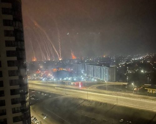 Яркие вспышки и взрывы произошли в Киеве около 04:22 по местному времени (05:22 мск). Очевидцы выкладывают фото и видео с кадрами разрывов, озаряющих небо над украинской столицей. В сети распространяется видео о том, что местным жителям удалось снять, как неизвестный «летательный аппарат», сбитый средствами ПВО, рухнул во двор жилых домов. На месте работают пожарные. Подлинность видео не подтверждено.