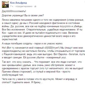 Альфред Кох, ранее часто выступавший с критикой российских властей, сделал неожиданное заявление о ситуации на Украине. В одной из социальных сетей он заявил о том, что не понимает, как незалежная собирается отдавать кредиты Евросоюзу.