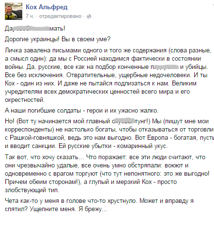 - Газ покупают, электричество. И вообще какая-то торговлишка с Россией идет. При этом категорически настаивают, чтобы Запад санкций не снимал и с Россией не торговал и нес убытки, - написал Кох.