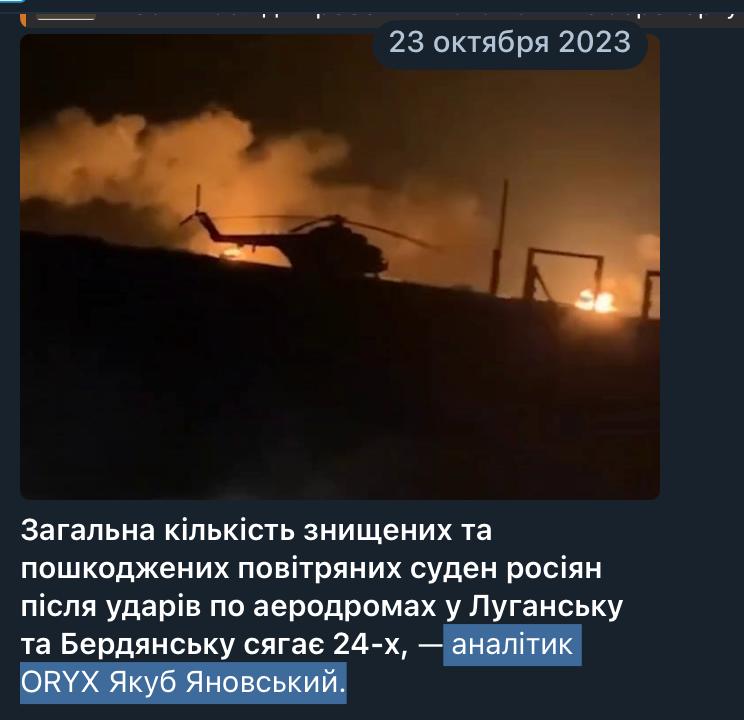 Позднее ведущие киевские СМИ массово опубликовали видео с якобы ударом по крымскому аэродрому «Кировское» с вертолётами ВКС России. Как оказалось, оно снято в октябре 2023 года. На нём запечатлены последствия удара ракет ATACMS по российским вертолётам в Бердянске. На Rutube этот ролик залит 2 года назад.
