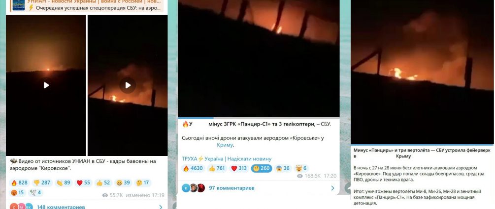 СБУ заявило об уничтожении российского ЗГРК «Панцирь-С1» и трёх вертолётов на крымском аэродроме «Кировское». Сообщается, что удар нанесён в ночь с 27 на 28 июня при помощи дронов.