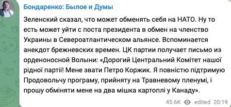 Украинский историк и политолог Константин Бондаренко «придрался» к словам Зеленского по поводу «обмена на НАТО». Эксперт вспомнил анекдот, как украинец в трудные советские времена, когда были проблемы с продуктами питания, предлагал обменять его на два мешка картошки у Канады.