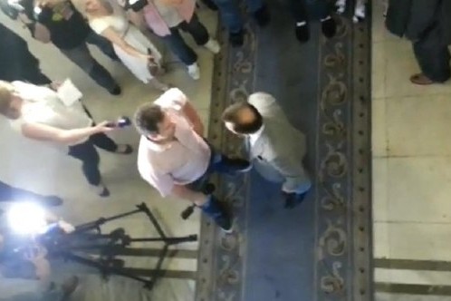 Присутствующие в этот момент скандировали «Ганьба» (с украинского «позор»), а народный депутат выпихнул корреспондентов за дверь.