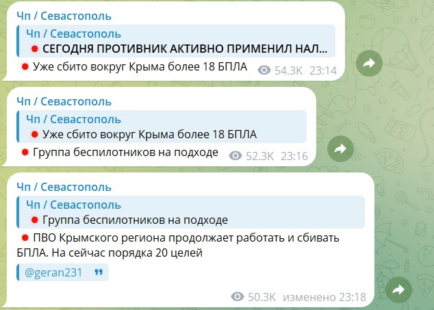 «Во время тревоги были ликвидированы два морских безэкипажных катера. Джанкой, Феодосия, Севастополь, Черноморское и Генический район слышат работу по БПЛА и реактивных систем залпового огня. Вероятность ракетной атаки на Крым сохраняется. Пока идёт «прогрев» дронами. Ночь будет тяжёлая. Ночью Крыму нужно быть внимательным. Атака дронов часто бывает перед ракетной. Сил нашим защитникам», - пишут местные Телеграм-каналы.