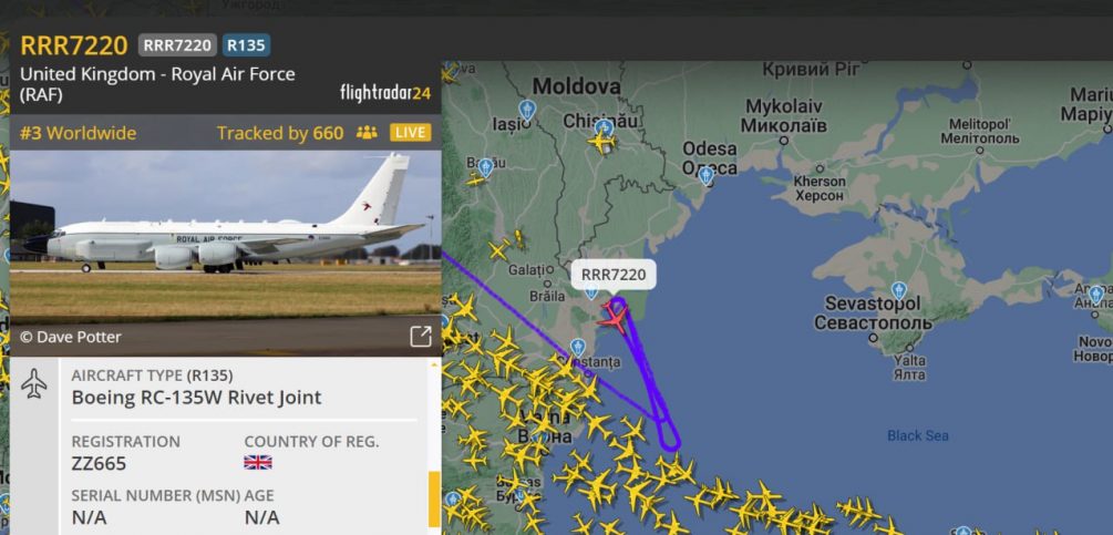 Разведывательный Boeing RC-135W Rivet Joint, принадлежащий Королевским ВВС Великобритании, плотно работает над западной частью акватории Чёрного моря с прицелом на Севастополь. Об этом днём написал военкор Юрий Котенок.