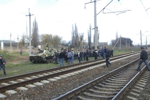 По данным СМИ, в районе Пчелкино возле города Краматорска безоружные жители на автомобиле попытались разорвать колонну из нескольких БМД, направлявшуюся на аэродром, который со вчерашнего вечера удерживают украинские военные.