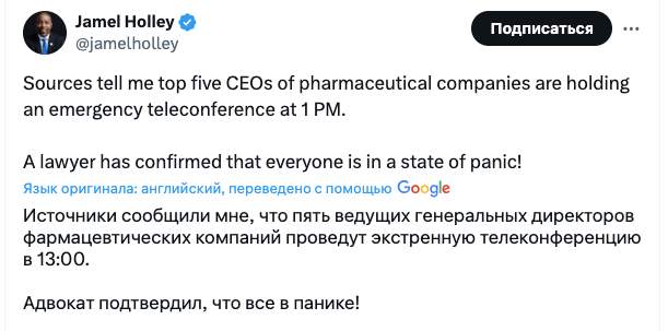 На этом фоне неслучайным выглядит сообщение о том, что в руководстве пяти крупнейших фармацевтических компаний Big Pharma началась настоящая паника. Это та самая Big Pharma, которой приписывают навязывание опасной вакцины против Covid19 и вообще называют спонсорами Великой перезагрузки и Нового мирового порядка.