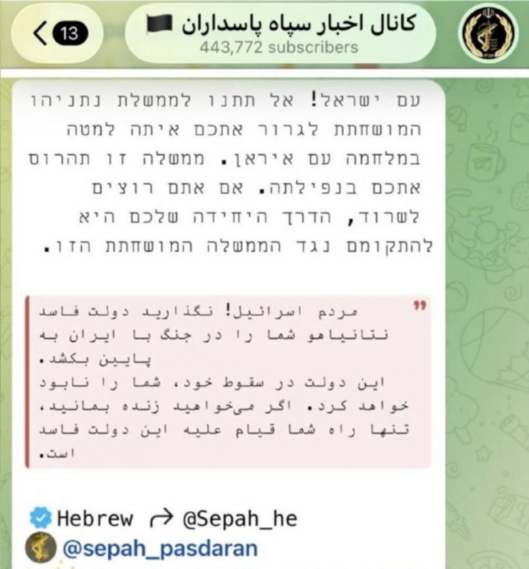 «Народ Израиля! Не позволяйте коррумпированному правительству Нетаньяху втянуть вас в войну с Ираном. Это правительство в своем падении уничтожит вас. Если вы хотите выжить, ваш единственный путь — это восстание против этого коррумпированного правительства», - говорится в сообщении.
