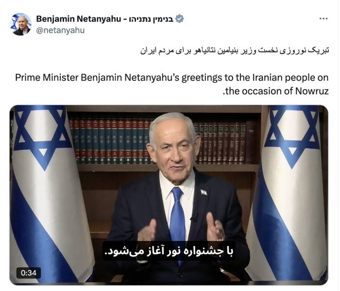 «Я пользуюсь этой возможностью, чтобы пожелать вам счастливого Навруза — года свободы, нового начала надежды для всех вас, дорогие друзья», — говорит в видеообращении, размещенном на странице в Х Нетаньяху.