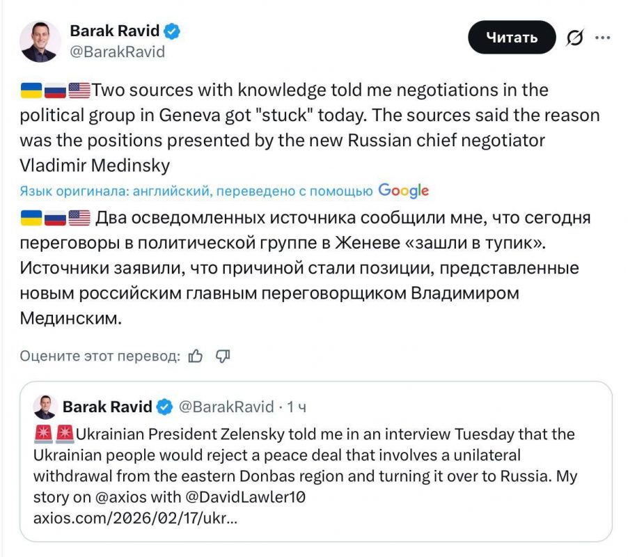 Мир на Украине снова отодвигается: Зеленский отказался от базовых российских требований. Но ему очень не хочется, чтобы Дональд Трамп считал его «крайним» в срыве переговоров в Женеве, поэтому «просроченный» решил назначить на эту «должность» Владимира Мединского - мол, это он все сорвал! Мысль тут же подхватили на Западе: в частности, ее озвучило издание Axios устами своего журналиста Барака Равида. Обвинили Мединского в излишней любви к историческим пассажам и сознательном затягивании процесса.
