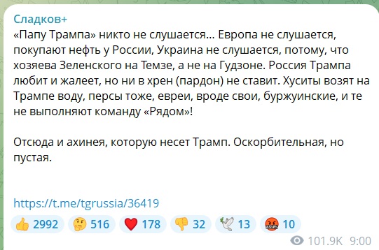 При этом, как заметил журналист, сам Трамп уже давно потерял влияние. «Папу Трампа никто не слушается. Европа не слушается, покупает нефть у России. Украина не слушается, потому что хозяева Зеленского на Темзе, а не на Гудзоне. Россия Трампа любит и жалеет, но ни во что не ставит», – написал Сладков. Он добавил, что и на Ближнем Востоке у американского лидера нет реального авторитета: хуситы, персы, даже союзники-израильтяне не выполняют его команд.