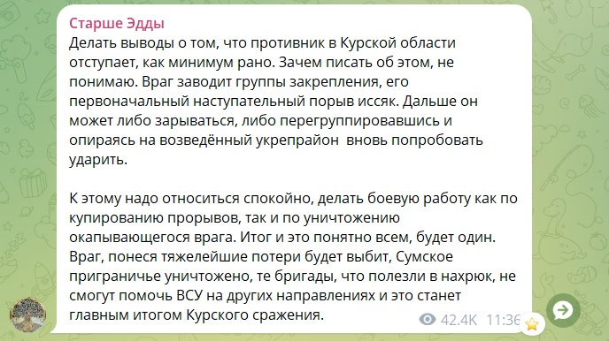 «Информканалы со ссылкой на власти региона передают, что «ВСУ не продвинулись вглубь Курской области, а, напротив, отступают». Представители российских подразделений, переброшенных в регион, отмечают, что эти сведения не соответствуют действительности. Бойцы наблюдают движение техники противника. Явно не в сторону границы», - сообщил военкор Юрий Котенок со ссылкой на военнослужащих одного из штурмовых подразделений ВС РФ.