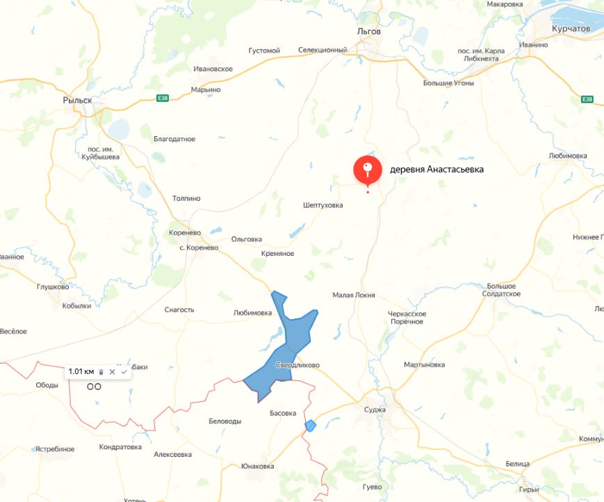 Телеграм-канал «Два майора» утверждает, что стрелковый бой идёт в селе Анастасьевка, откуда до окраин Льгова менее 20 км. Враг лелеет надежду выйти через Льгов на Курчатов, где расположена Курская АЭС.