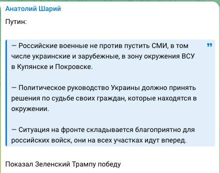 Ранее президент Владимир Путин рассказал о масштабном окружении украинских войск блокировке группировок ВСУ в районе Купянска и Красноармейска (российское название Покровска). Глава российского государства предложил журналистам стать свидетелями "котла".