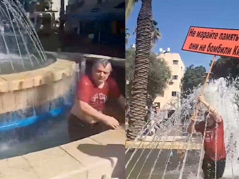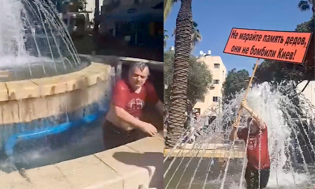 Евреи праздновали 9 мая в Израиле в городе Хайфа, проводили шествие Бессмертный полк. В этот момент к ним подошел украинец и решил испортить праздник: выставил плакат «Не марайте дедов — они не бомбили Киев!». После этого его опрокинули в городской фонтан. А когда вылез из воды, женщина крикнула ему на русском языке: «Вон отсюда, тварь!».