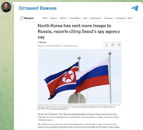 В частности, именно британское агентство сообщило, что «Северная Корея перебросила дополнительные войска в Россию, но масштабы контингента не были известны сразу». Также издание утверждает, что спецназ Ким Чен Ына отправлен в зону боевых действий в Курскую область, где сражается с украинскими боевиками, «прорываются через границу в западный регион России».
