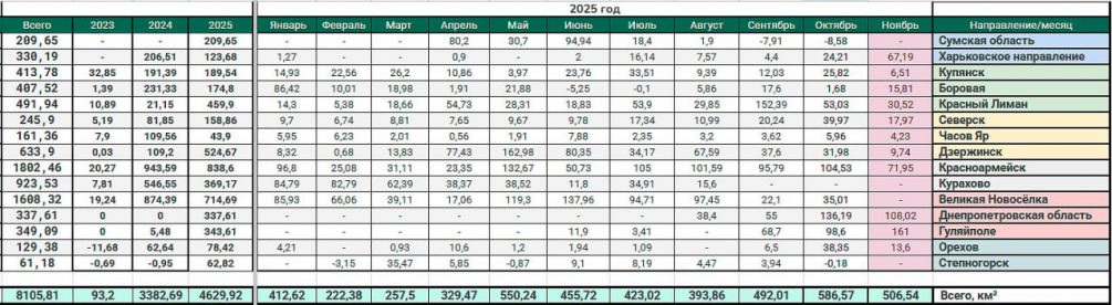 Телеграм-канал «Сливочный каприз», освещающий спецоперацию, привёл итоговую статистику о результате боевых действий за ноябрь 2025 года. Контролируемая российской армией площадь выросла на 506,54 км². В целом за время осенней кампании занято более 1500 квадратных километров. Темпы продвижения в ноябре составляли в среднем почти по 17 км² в сутки. Наибольших успехов наши военные добились в районе Покровска, Гуляйполя и на территории Днепропетровской области. Напомним также, что Генштаб заявил об освобождении Купянска и начале боёв в Северске и Красном Лимане.