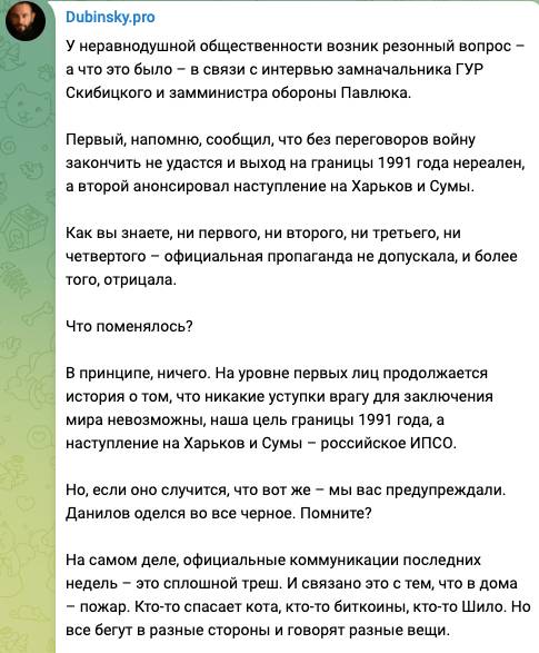 «На самом деле, официальные коммуникации последних недель – это сплошной треш. И связано это с тем, что в дома – пожар. Кто-то спасает кота, кто-то биткоины, кто-то Шило (Артем Шило - советник офиса Зеленского и сотрудник СБУ, обвиненный в организации коррупционной схемы при закупке трансформаторов в Узбекистане). Но все бегут в разные стороны и говорят разные вещи», - пишет Дубинский.