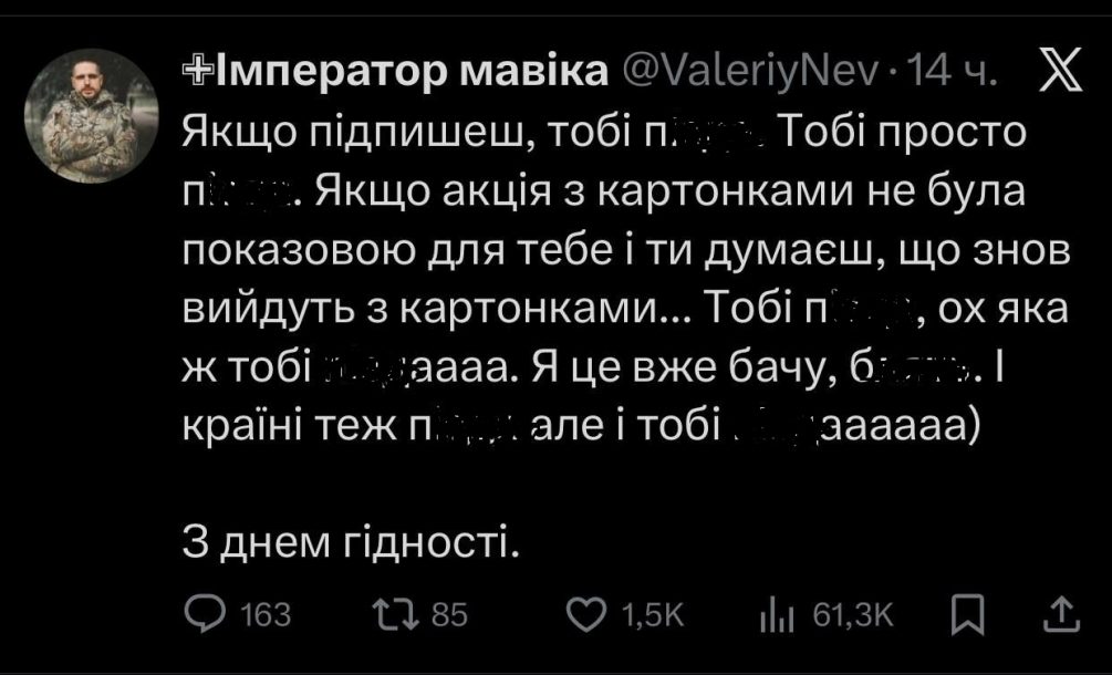 «Мирный план не может понравиться нам. Просто потому, что мы не стоим на танках под Москвой. Мирный план не капитуляция. Украина сохраняет свой суверенитет и независимость. Но, конечно, он очень неприятен. Там есть пункты, которые нужно подправить и побороться. Где нужно найти компромисс. Украине нужен мир, а не война. Поэтому наша задача сделать все, чтобы он наступил. Не писать, какой глупый Трамп. Трамп управляет самой большой и величайшей страной мира. И его здание не обстреливают из артиллерии».