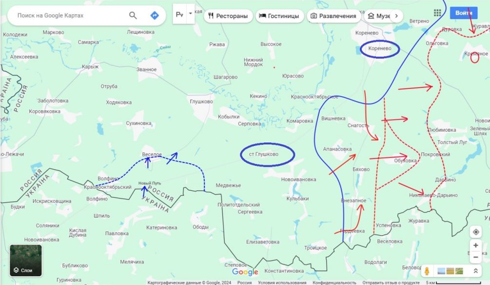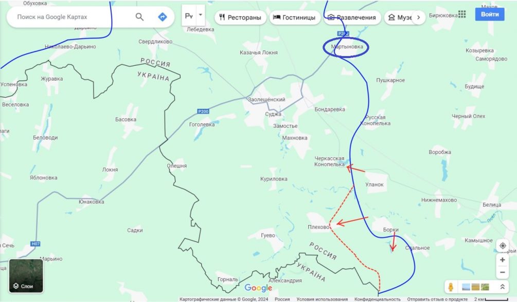 На рубеже между Мартыновкой и Кругликом удалось уточнить зону контроля ВСУ. Противник занял часть лесных участков в балках у реки Смердица, расположенной к северу от Мартыновки. С других участков фронта информации о значительных изменениях зон контроля или новых атаках не поступало. Ситуация остается напряженной, и обе стороны продолжают активные действия.