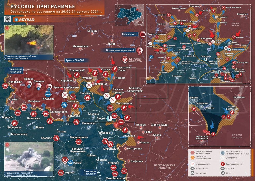 Добавим, что сегодня польский президент Анджей Дуда признал, что танки из Варшавы PT-91 Twardy участвуют в нападении ВСУ на Курскую область. Отметим, что сейчас неизвестна даже приблизительная площадь оккупации. Несколько дней назад сообщалось о 30 захваченных сёлах. В последней сводке из зоны спецоперации сообщается об ударах по позициям армии Украины в районах н.п.: Апанасовка, Вишневка, Борки, Краснооктябрьский, Кругленькое, Михайловка, Любимовка, Малая Локня, Плехово, Снагость и Южный.