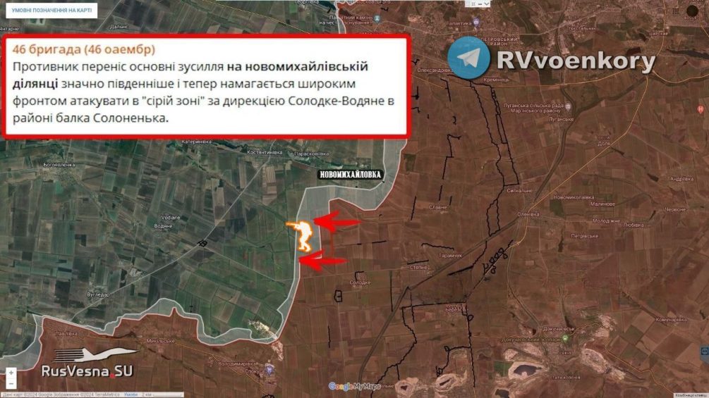 В 46-ой бригаде ВСУ заявили, что ВС РФ перенесли основные усилия на новомихайловском участке значительно южнее и теперь широким фронтом атакуют в серой зоне по линии Солодке-Водяное.