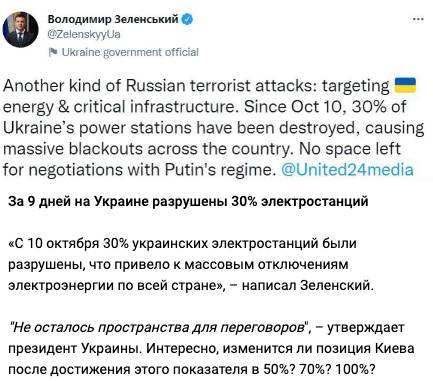 «С 10 октября 30% электростанций Украины были разрушены, что вызвало массовые отключения электричества по всей стране», — написал в соцсетях украинский лидер.