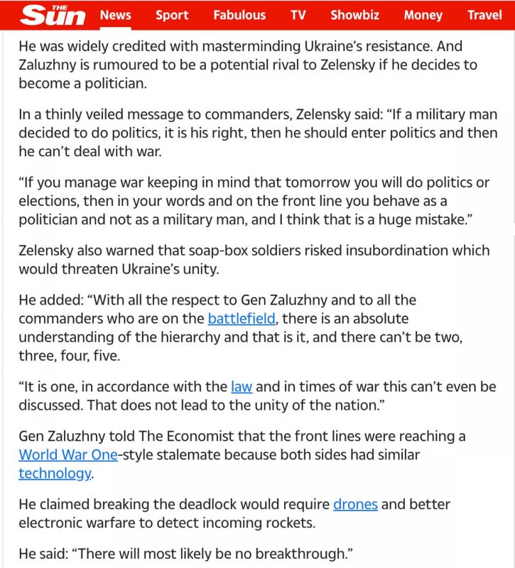 «Если он войдёт в политику, тогда он не сможет заниматься делами на фронте. Если вы управляете армией, помня о том, что завтра вы будете заниматься политикой или выборами, то на словах и на линии фронта вы ведёте себя как политик, а не как военный, и я считаю, что это огромная ошибка. При всем уважении к генералу Залужному и ко всем командирам, которые находятся на поле боя, но должна быть абсолютная иерархии», — заявил президент Украины, намекая на отставку.