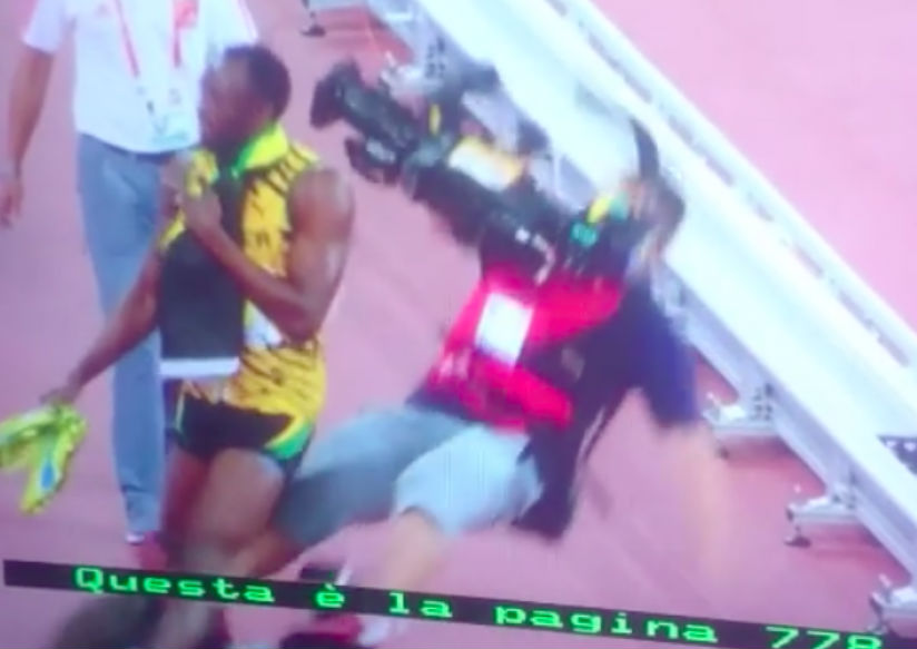 Неприятный случай произошел вчера после победы Усэйна Болта в забеге на 200 метров. Пока бегун радовался победе и размахивал руками, телеоператор в поисках лучшего кадра следовал за ним на самокате. Неуклюжий мужчина наехал на ограждение и рухнул на землю, буквально подкосив спортсмена.