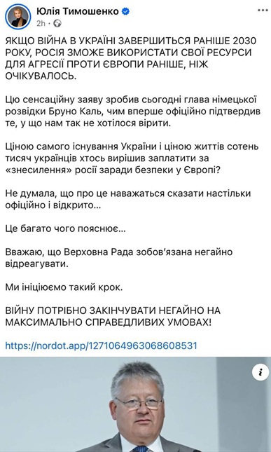 «Бруно Каль официально подтвердил то, во что нам так не хотелось верить. Самим существованием Украины и жизнями сотен тысяч украинцев кто-то решил заплатить, чтобы измотать Россию ради безопасности в Европе. Не думала, что об этом решатся сказать столь официально и открыто. Это многое объясняет. Считаю, что Верховная Рада обязана немедленно отреагировать. Мы инициируем такой шаг. Войну нужно заканчивать немедленно на максимально справедливых условиях!»