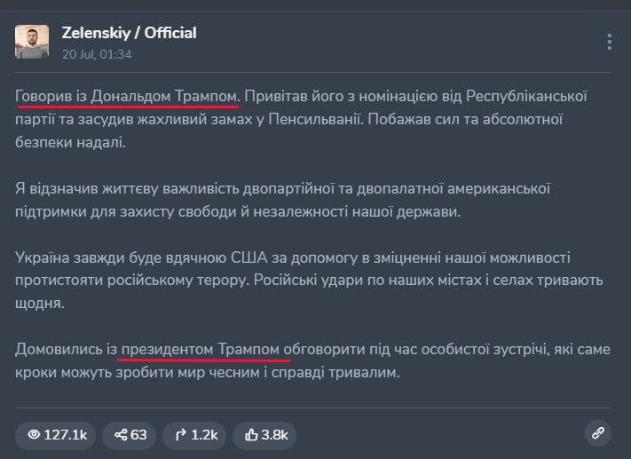 «Говорил с Дональдом Трампом. Я отметил жизненную важность двухпартийной и двухпалатной американской поддержки для защиты свободы и независимости нашего государства. Договорились с президентом Трампом обсудить во время личной встречи, какие именно шаги могут сделать мир честным и по-настоящему долгим».