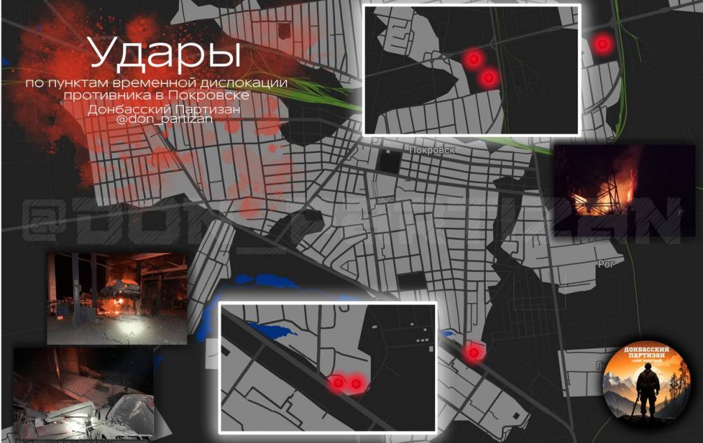 Ночью российскими войсками нанесено четыре ракетных удара по пунктам дислокации противника в Покровске (Красноармейске). Двумя попаданиями поражена территории Машиностроительного завода.