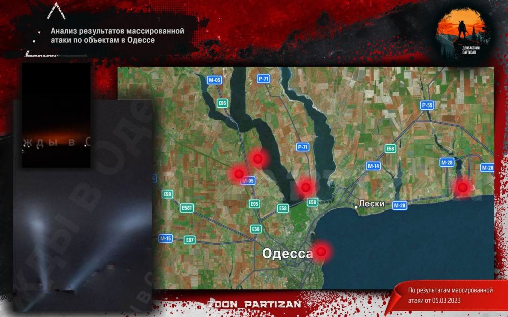 В ночь на 5 марта применялись ударные дроны. Целями ударов стала портовая инфраструктура, районы расположения средств ПВО, РЭБ и пункты дислокации противника. Местные паблики сообщили о минимум 9 прилётах: ВКС России поразили территорию аэродрома «Гидропорт», здания санатория, где жили боевики ВСУ, два порта и объекты в пригородах Одессы.