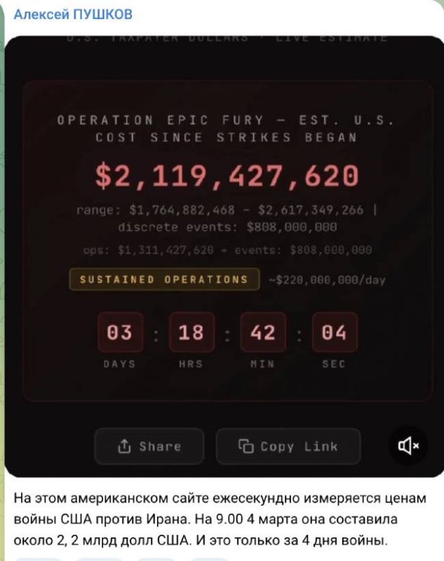 «На этом американском сайте ежесекундно измеряется цена войны США против Ирана. На 9.00 4 марта она составила около 2, 2 млрд долл США. И это только за 4 дня войны».