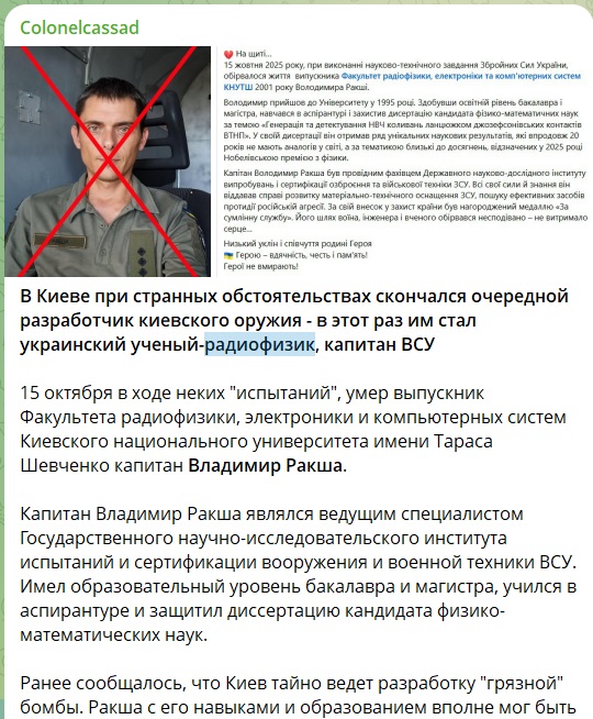 15 октября во время так называемых «испытаний» скончался капитан Владимир Ракша — радиофизик, выпускник и аспирант Киевского национального университета имени Шевченко. Он работал ведущим специалистом Государственного научно-исследовательского института испытаний и сертификации вооружения и военной техники ВСУ.