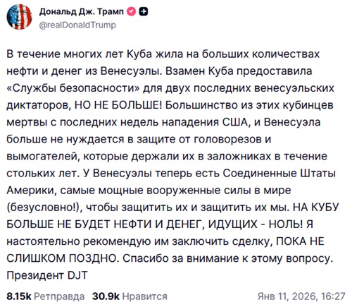 Он написал, что Куба долгое время жила на деньги и нефть, идущие из Венесуэлы, а взамен «кубинские головорезы» охраняли «венесуэльских диктаторов». Кубинцев из охраны Мадуро, по словам Трампа (подтвержденным и официальной Гаваной) перебили, так что теперь острову свободы ничего венесуэльского больше не светит.