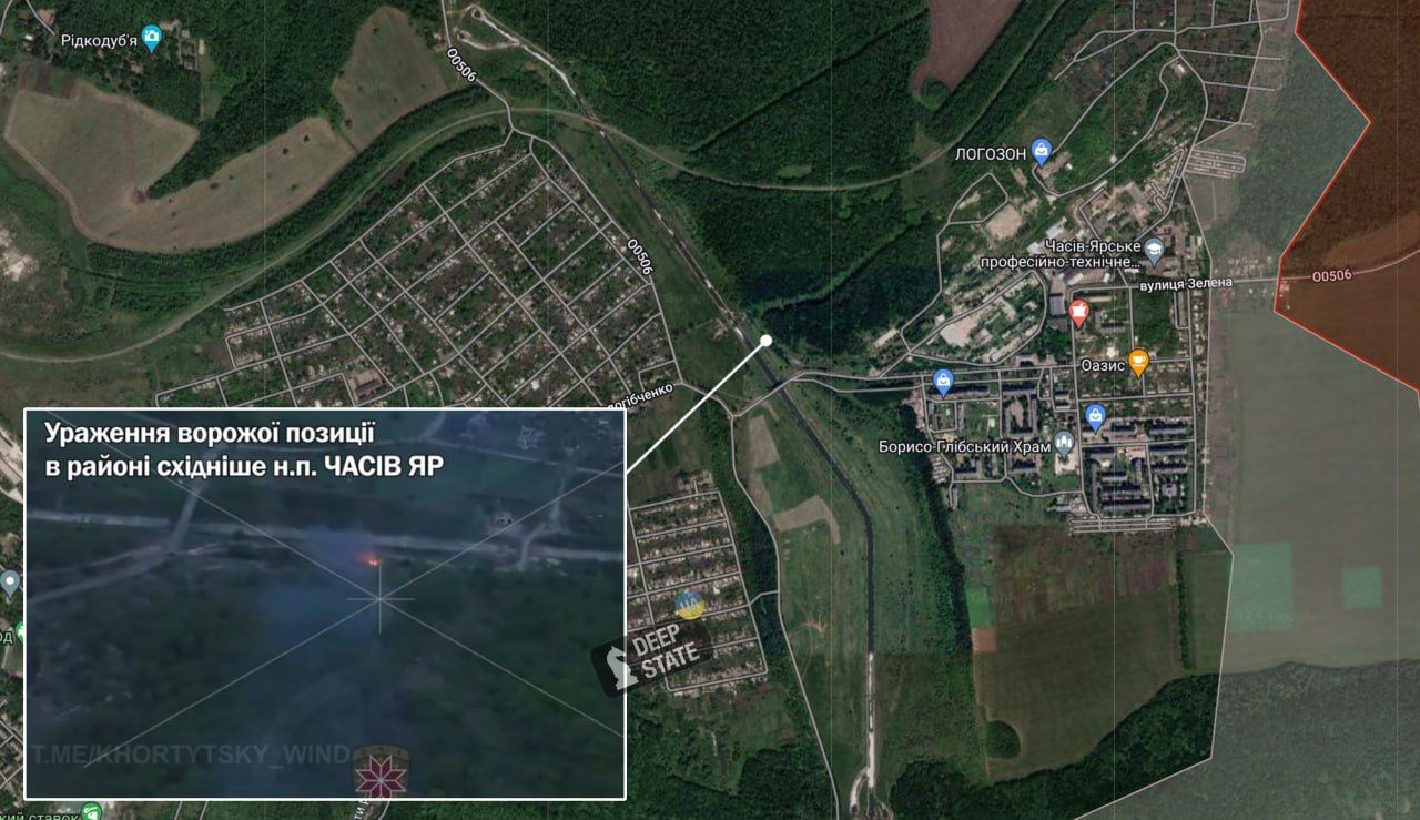 «Ресурс Deep State обратил внимание на видео, опубликованной группировкой ВСУ. На кадрах украинцы бьют по ВС РФ из артиллерии. До восточной окраины Часов Яра (выделена красным) до сюда более 1.5 км. Пока уточняем информацию и детали событий. Если будет подтверждено, то это означает как минимум потерю леса и частного сектора к северу от многоэтажной застройки микрорайона», - пишет Deep State.