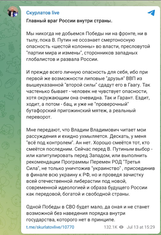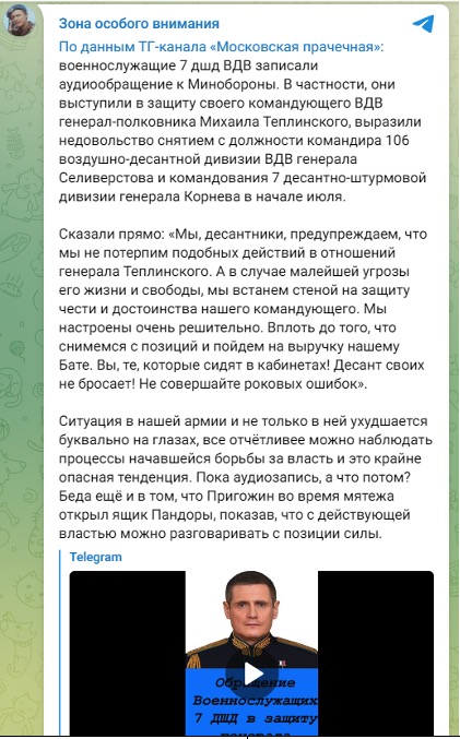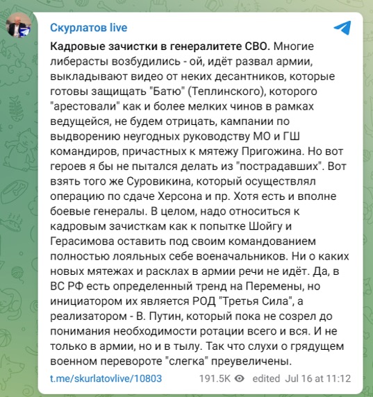 Так, 15 июля канал Скурлатова опубликовал фейковое обращение российских десантников, которые якобы выступили в защиту генерал-полковника Михаила Теплинского.