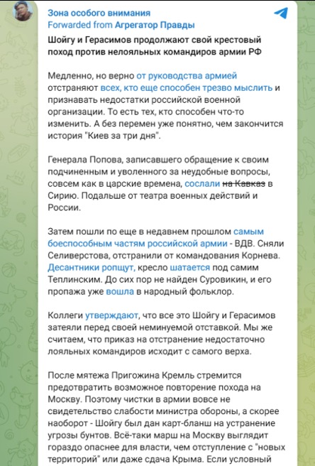 Этот же канал утверждал, что высшее руководство Минобороны «продолжает свой крестовый поход против нелояльных командиров армии РФ».