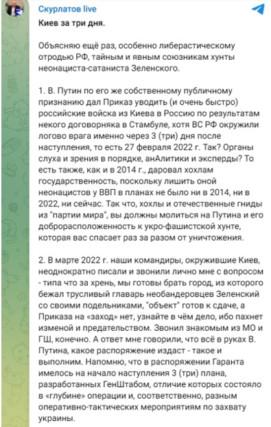 Кроме того, неоднократно утверждалось, что российская власть действует чуть ли не в сговоре с врагом и делает все, чтобы затягивать проведение спецоперации.