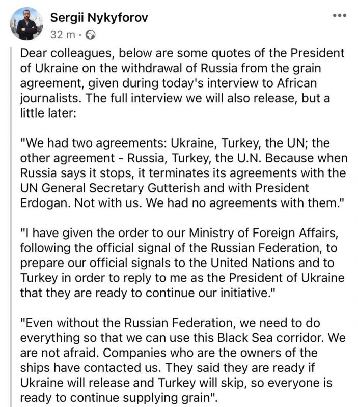 Зеленский напомнил, что «у нас было два соглашения: Украина, Турция, ООН, другое соглашение - Россия, Турция, ООН. Поэтому, когда Россия говорит, что она прекращает, она прекращает свои соглашения с генсеком ООН Гуттеришем и с президентом Эрдоганом. А не с нами. У нас с ними никаких договоренностей не было. Даже без Российской Федерации нам нужно сделать все, чтобы мы могли использовать этот черноморский коридор. Мы не боимся».
